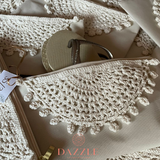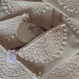 The bag is made from ecru canvas material and crafted with a crochet bib attached.
